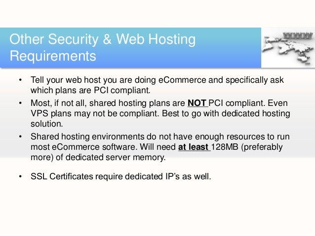Payment Card Industry (PCI) • Most, if not all, shared hosting plans are NOT PCI compliant. Even VPS plans may not be compliant. Best to go with dedicated hosting solution. • Themeforest.net Over 70+ eCommerce Themes WordPress eCommerce Themes . Popular WordPress eCommerce Plugins. 1. ... Visit Document